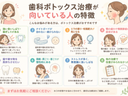 コラム 歯科ボトックスの副作用やリスクは? 治療前に知っておきたい安心のポイント 歯ぎしりや食いしばり、顎関節症の症状をやわらげる治療として注目されている歯科ボトックス(ボツリヌス療法)。「注射」と聞くと、副作用やリスクが気になる方も多いのではないでしょうか。 歯 […] 記事をシェア